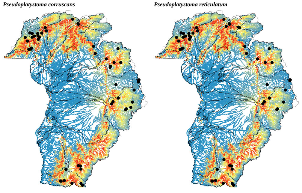 | Figura 1. Probabilidade de uso como área de desova para Pseudoplatystoma corruscans e Pseudoplatystoma reticulatum na RH Paraguai. Cores mais quentes representam maior probabilidade de desova, enquanto que áreas com menor probabilidade são indicadas por cores mais frias. Os pontos pretos indicam locais, informados pelos entrevistados, como sendo áreas de desova para a espécie. Mapa construído a partir de entrevistas com pescadores. Copyright: Dr. Yzel Rondon Suarez/UEMS-Dourados. Fonte financeira: MCTIC/CPP e ANA/Fundação Eliseu Alves. |